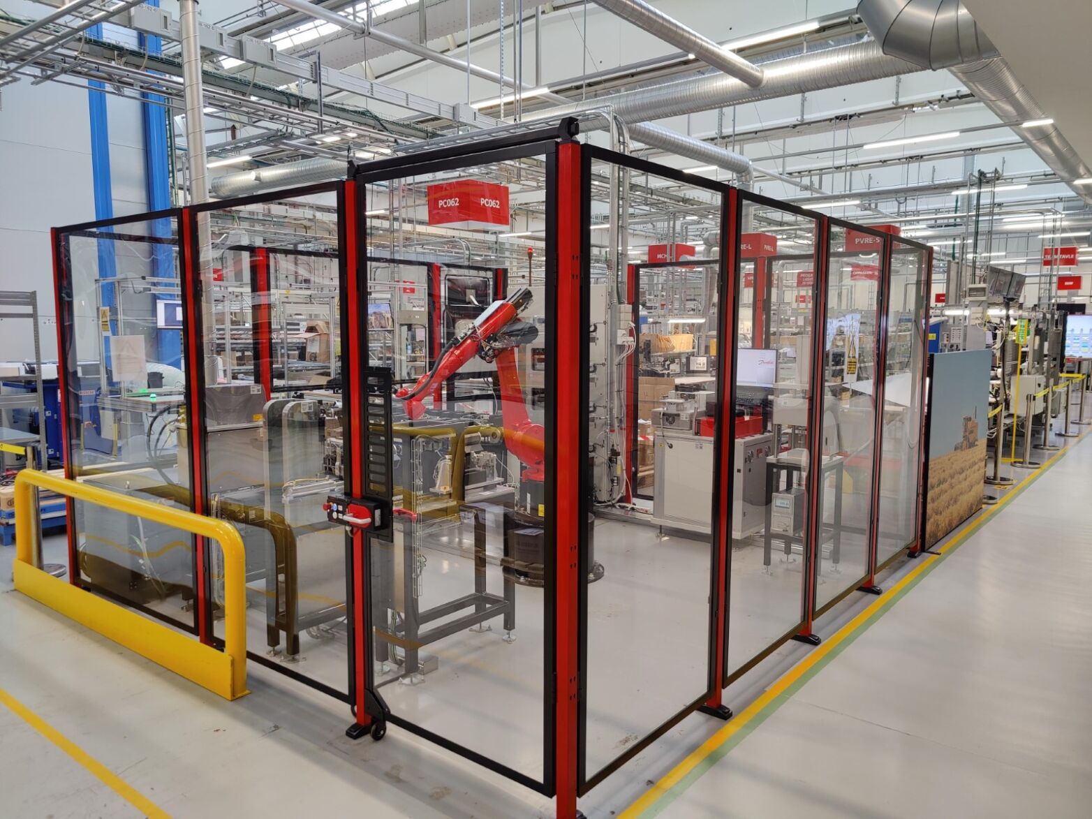En stor ildrød robot i midten af noget, som ligner et stort og avanceret schweizerur – det er anlægget, som samler Danfoss’ nye avancerede controllere.